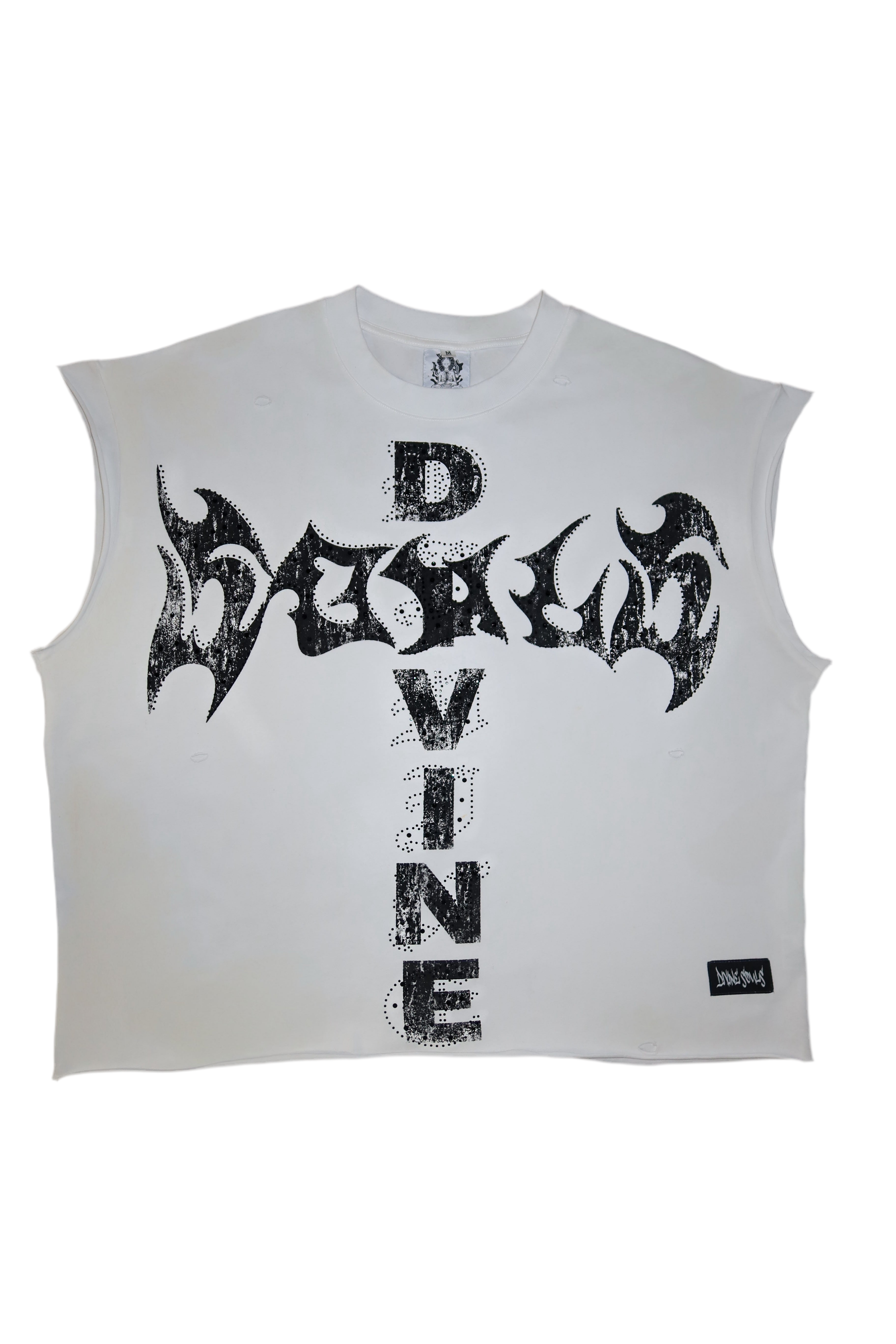 Fit: Premium cotton. Oversized silhouette. Drop-shoulder with cut-off sleeves. Rhinestoned graphic for a loud finish. True to size.